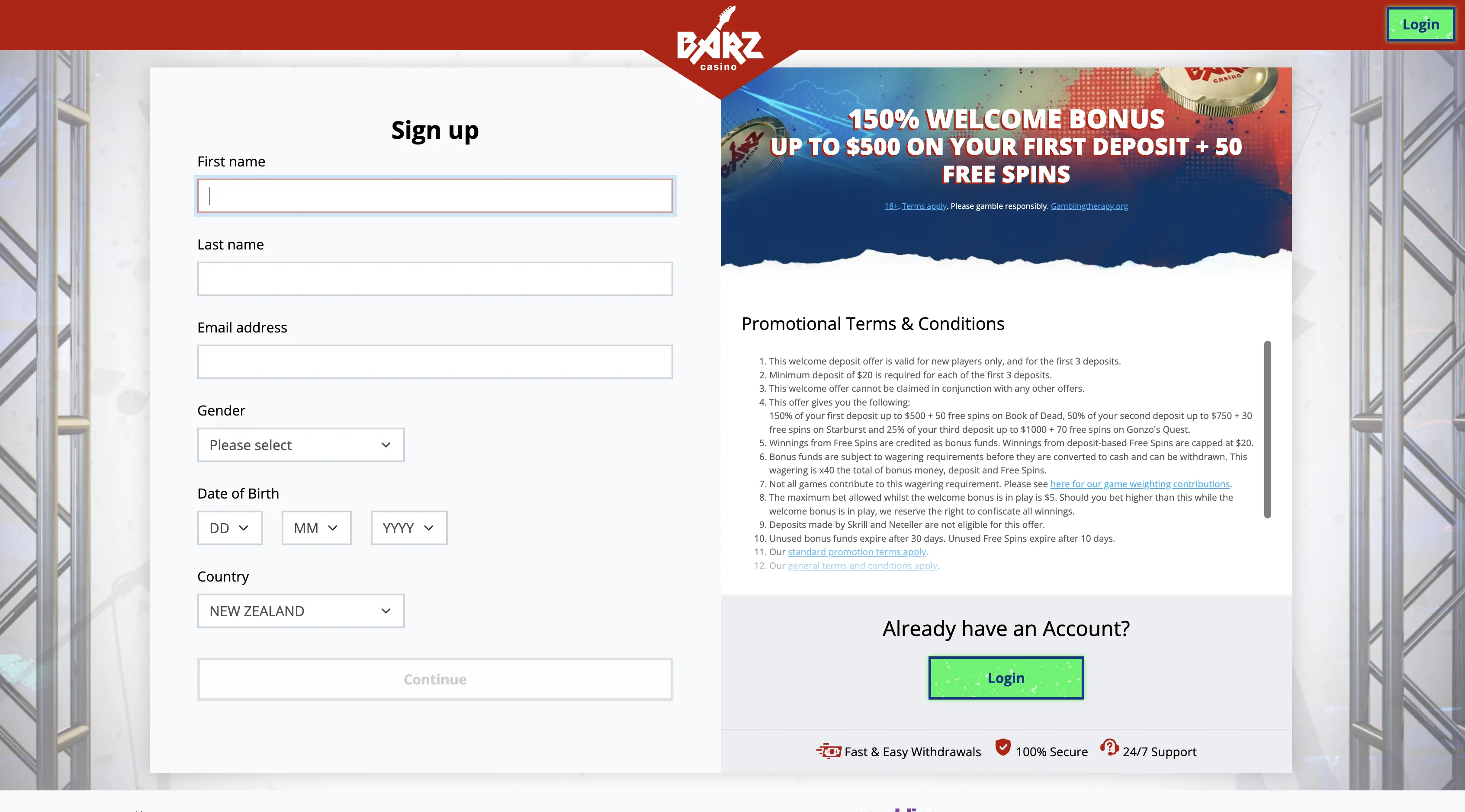 As someone who’s worked in the online gambling industry for more than a decade, I know my way around White Hate Gaming casinos – although I hadn’t played at Barz until now. From the moment I landed on the main Barz Casino NZ login page, I was able to create an account in a couple of minutes – and everything was standard here: no shocks or surprises.