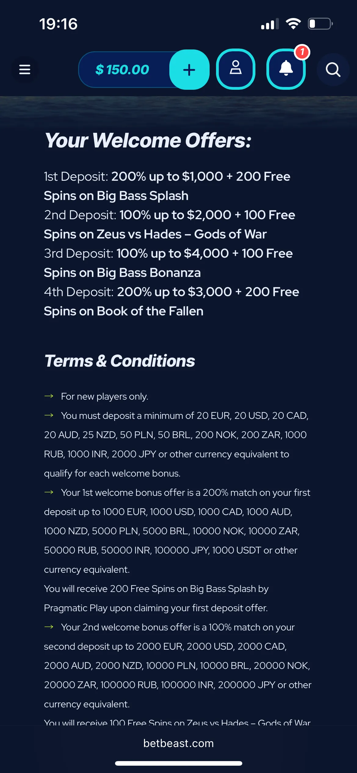 The welcome offer is pretty spectacular as it offers players a 600% bonus with 600 BetBeast free spins. This is spread over four deposits: