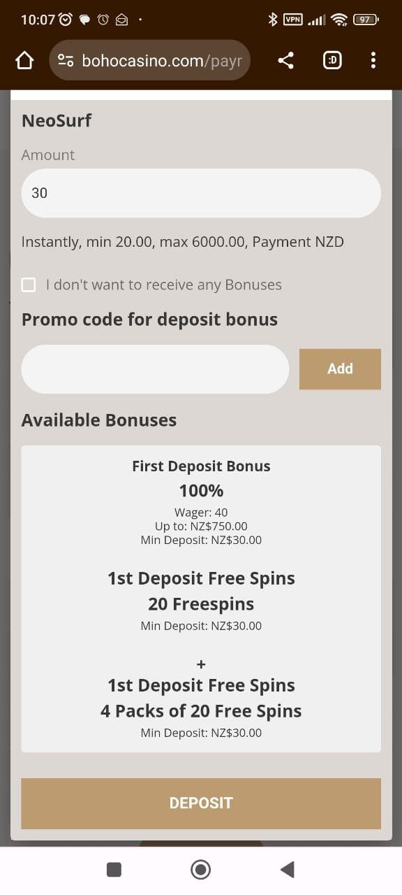 After a quick and easy registration, I deposited NZ$50 at Boho using NeoSurf. The money was instantly there and I qualified for the first deposit bonus so I took it. I had NZ$100 in my account, plus 20 free spins.