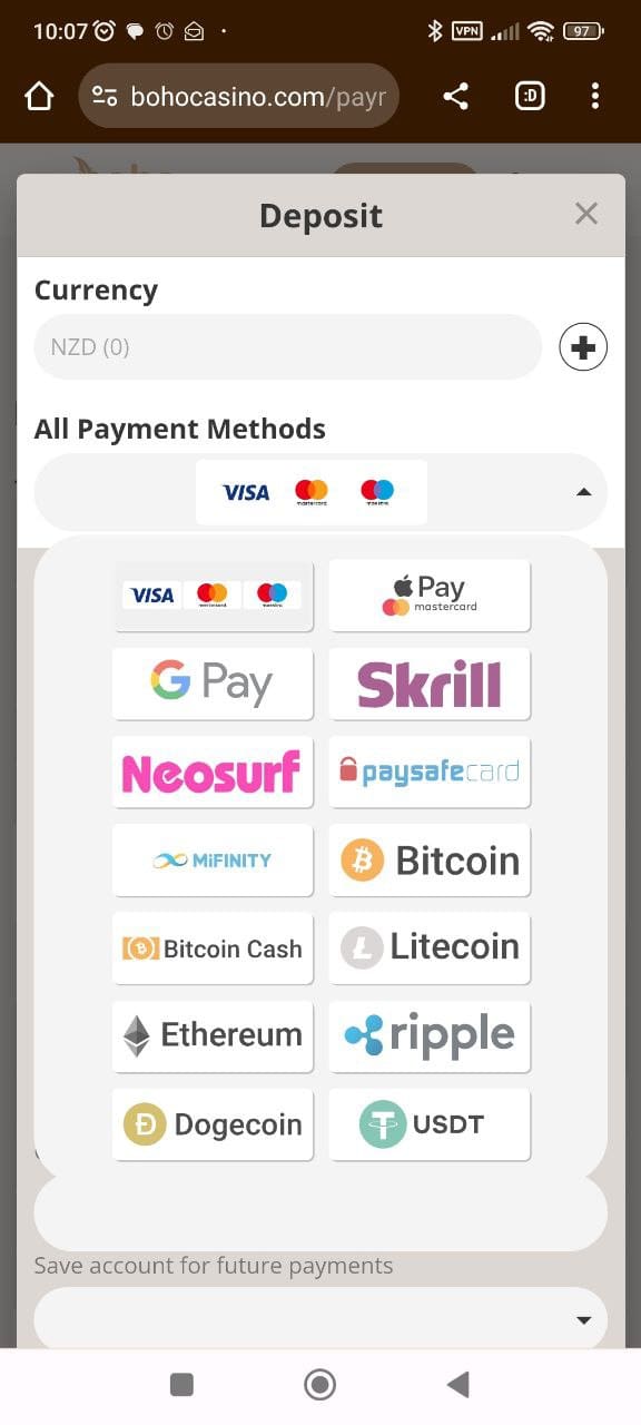 You can play in NZD at Boho casino and there are a lot of deposit options to choose from, mostly e-wallets as Boho seems to support all of them. You can use Visa, Mastercard, Apple Pay and Google Pay, too.