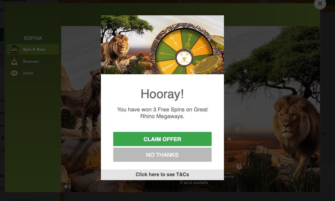 The feature that I was stocked with was Spin&Roar. This is a daily promotion that reminded me of a Wheel of Fortune. Players can spin it every day and receive free spins on popular pokies. I was lucky to receive 4 free spins on Great Rhino Megaways. I loved that the bonus feature matches the casino’s animal theme and roaring sounds. It looks and sounds really cool!