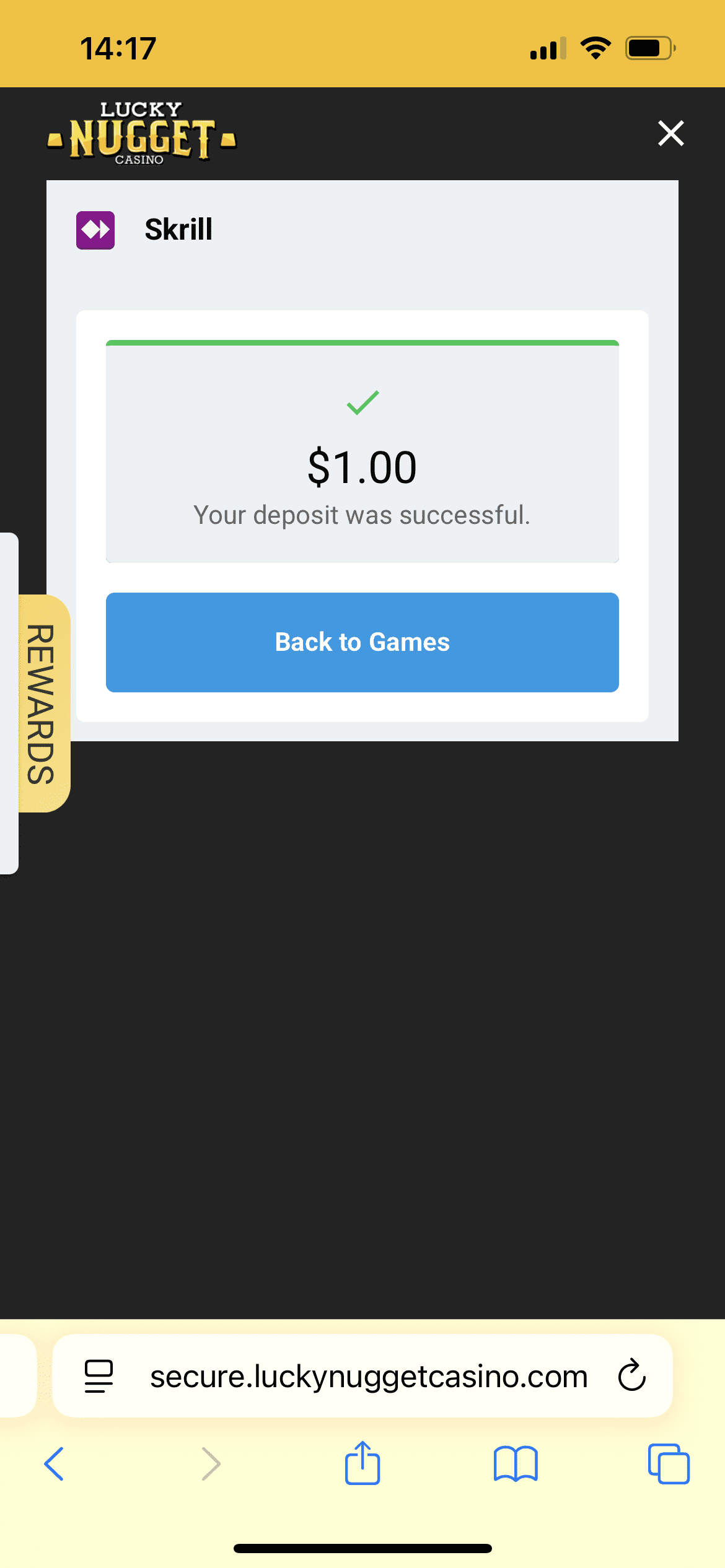 Method & amount: I made a first deposit of NZ$1 via Skrill. Not every method allows a one-dollar top-up — for crypto the minimum I saw was NZ$40, so Skrill was the practical way to pay tiny. The cashier flagged the casino offer instantly.