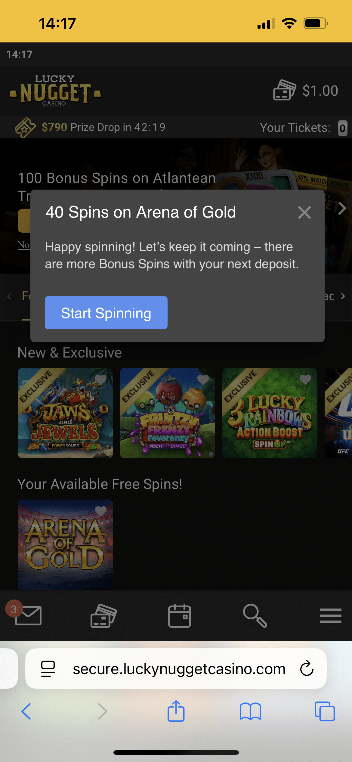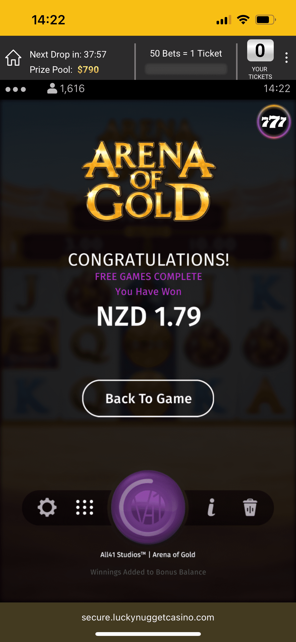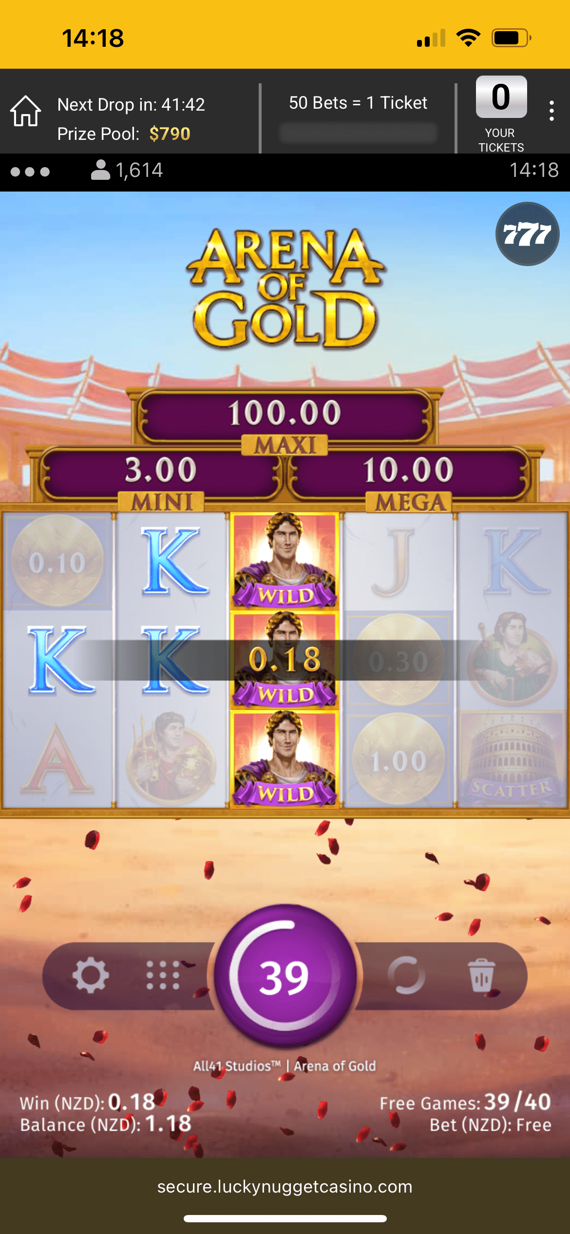 What I got: the site credited 40 free spins on Arena of Gold. I played them all and won NZ$1.79. With my NZ$1 stake, that left NZ$2.79 total. These free spins wins land as bonus money, which is fair — but do note the wagering.
