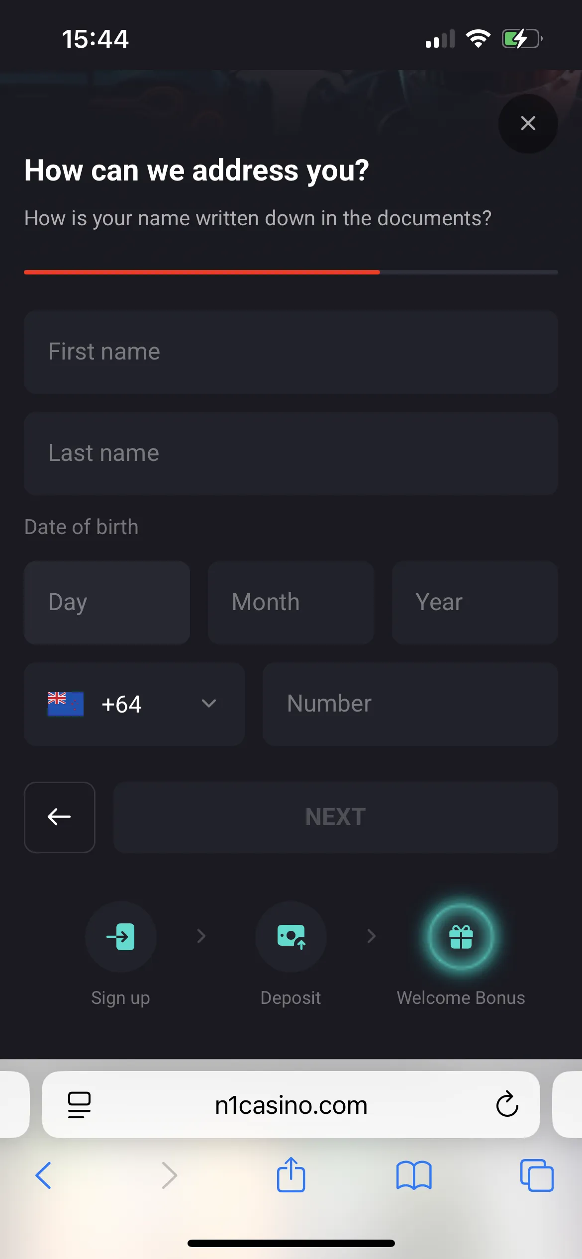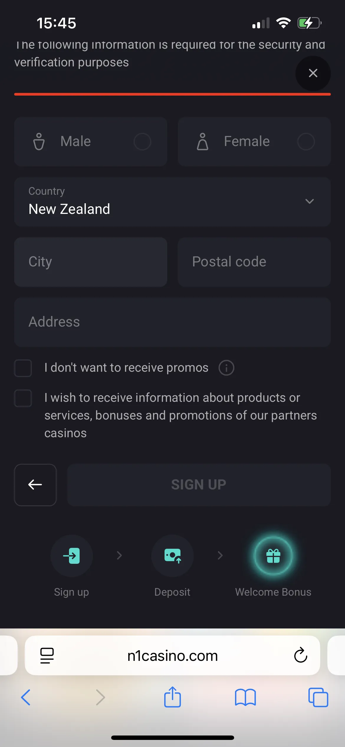 Proceed to the N1 official casino site and find the red Sign Up button. It is located in the upper right corner. After hitting it, you will see a registration form on your screen. Here you can add these details: