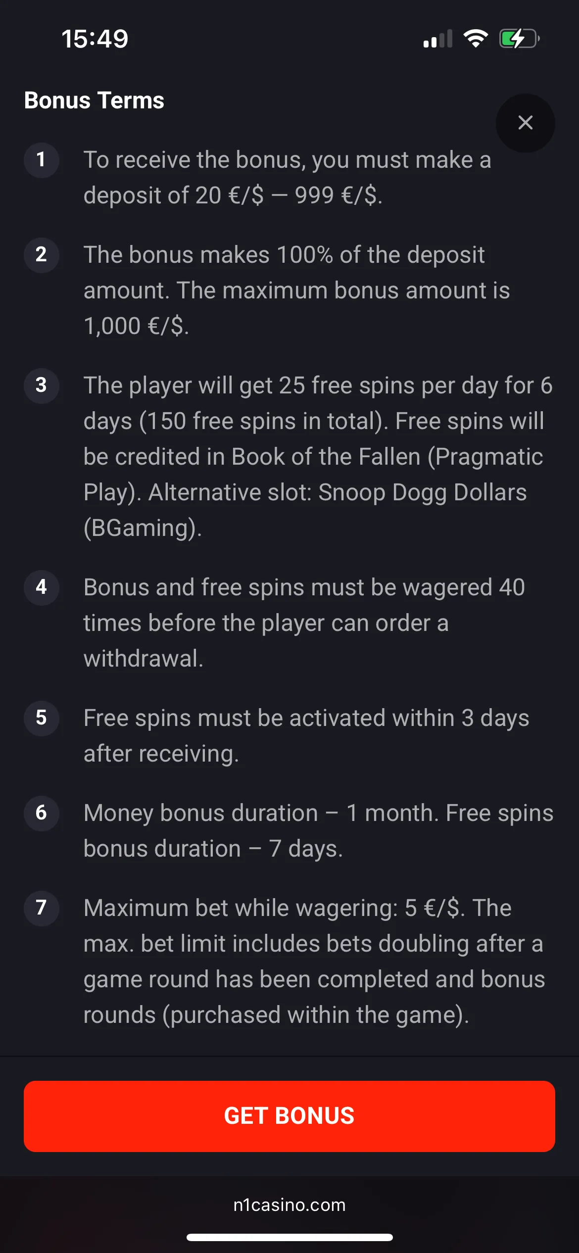 So, my experience started from registration, which isn’t super fast like at some crypto casinos that require only email and password. I had to provide quite a lot of details before I logged in. The minimum deposit required for a welcome bonus was 20 NZD. I quickly topped up my account via Skrill (unfortunately, N1 doesn’t accept crypto). The deposit was processed within a few minutes. Then I claimed a first deposit bonus, which was a 100% match up to 1,000 NZD + 150 FS. I got 20 NZD and 150 FS.