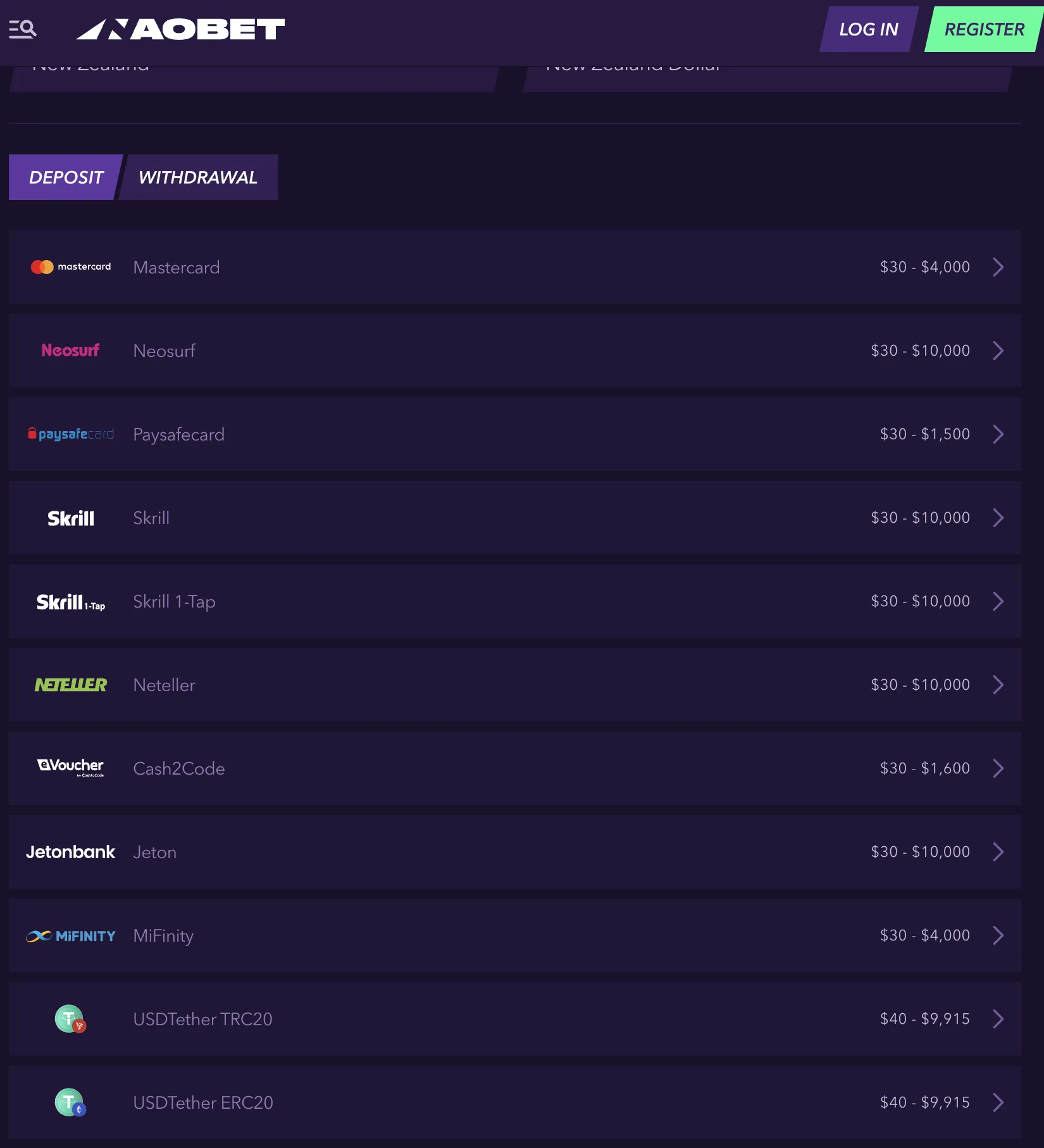 NaoBet Casino offers a decent selection of payment methods: