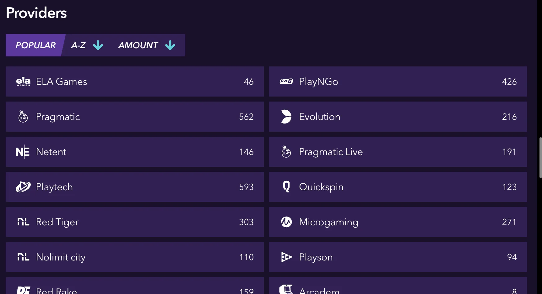 ELA Games, Pragmatic, Netent, Playtech, Red Tiger, Nolimit City, Red Rake, Gaming Corps, Casino Technology, Smartsoft, PlayPearls, Caleta, Ortiz, Candlebets, BetGamesTV, PlayNGo, Evolution, Pragmatic Live, Quickspin, Microgaming, Playson, Arcadem, Swintt, PariPlay, Mascot, Leap, Salsa Technology, Kiron, Ezugi, Givme, Zitro, G.Games, Claw, Stakelogic, Evoplay, Apparat, OnAir, Blueprint, Revolver, Kajot, OneTouch, Big Time Gaming, Rogue, Novomatic, Solidicon, Platipus, Skywind, Apollo Games, FBM, 3 Oaks Gaming, Ruby Play, Bally Wulff, Habanero, NetGaming, Spinmatic, Penguin King, Bombay Live, 7777 Gaming, MEGA, Onlyplay, Hacksaw Gaming, VoltEnt, Amigo Gaming, Spinomenal, Amusnet, Merkur, Yggdrasil, Iconic 21, Gamomat, Fazi, ELK, Endorphina, SlotMill, Booming Games, InOut, Zillion, Betsoft, BF Games, PatePlay, Shady Lady, Relax Gaming, Tequity, Vibra Gaming, Oryx, AvatarUX, GameBeat, Felix Gaming, TurboGames, Kalamba, Reevo, Fugaso, Tada Gaming, Aviator, Mancala, Playnetic, Winfinity, Game Time Tec, 1x2gaming, Iron Dog, Tom Horn, Expanse Studios, Gamzix, Thunderkick, Popiplay, Amatic, EGT Digital, Playhub, Rakerocket