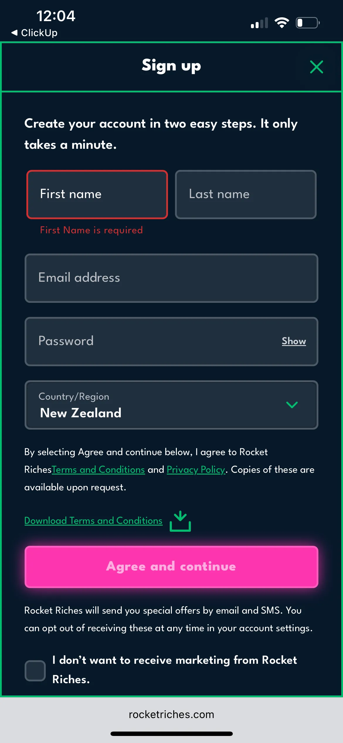 To create an account at Rocket Riches, proceed to the casino’s official website and click the Sign Up button in the upper right corner. Then provide the following information: