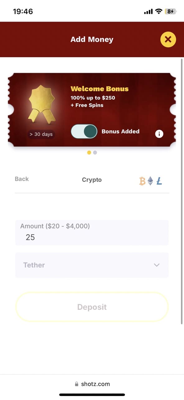 If you are someone who prefers digital currencies over fiat, Shotz NZ online casino accepts BTC, LTC, ETH and USDT.