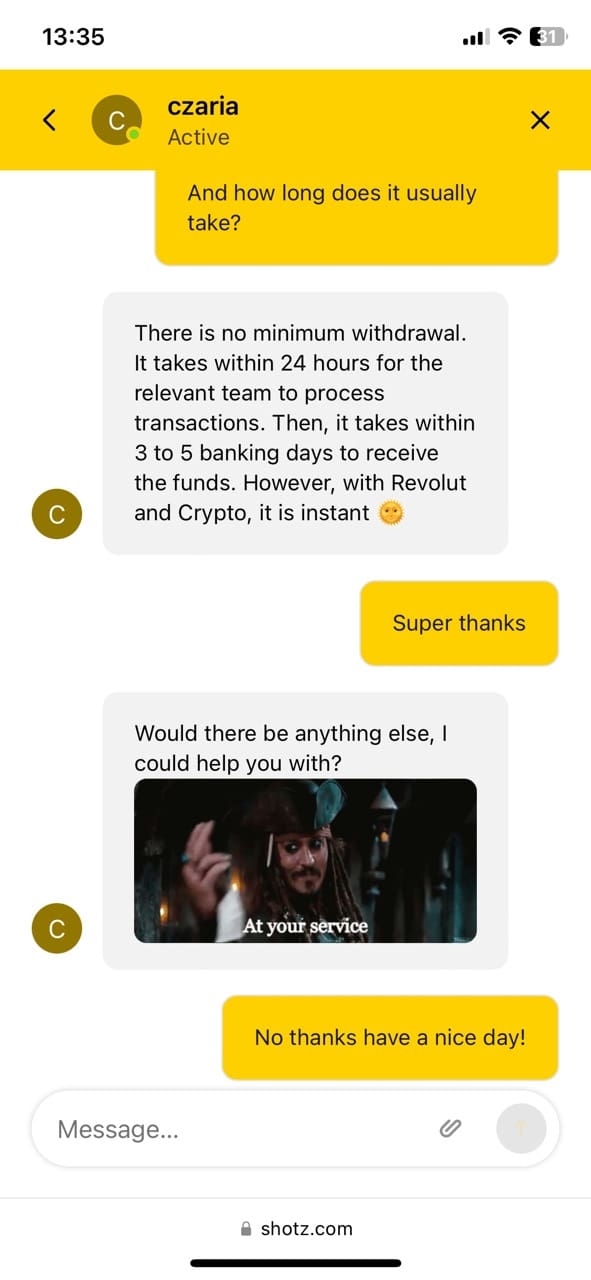 I was pleasantly surprised with the quality of customer support. The team answers quickly and to the point. The agent I had a yarn with even added memes to the conversation, which made me absolutely stoked with their nice approach to interaction.