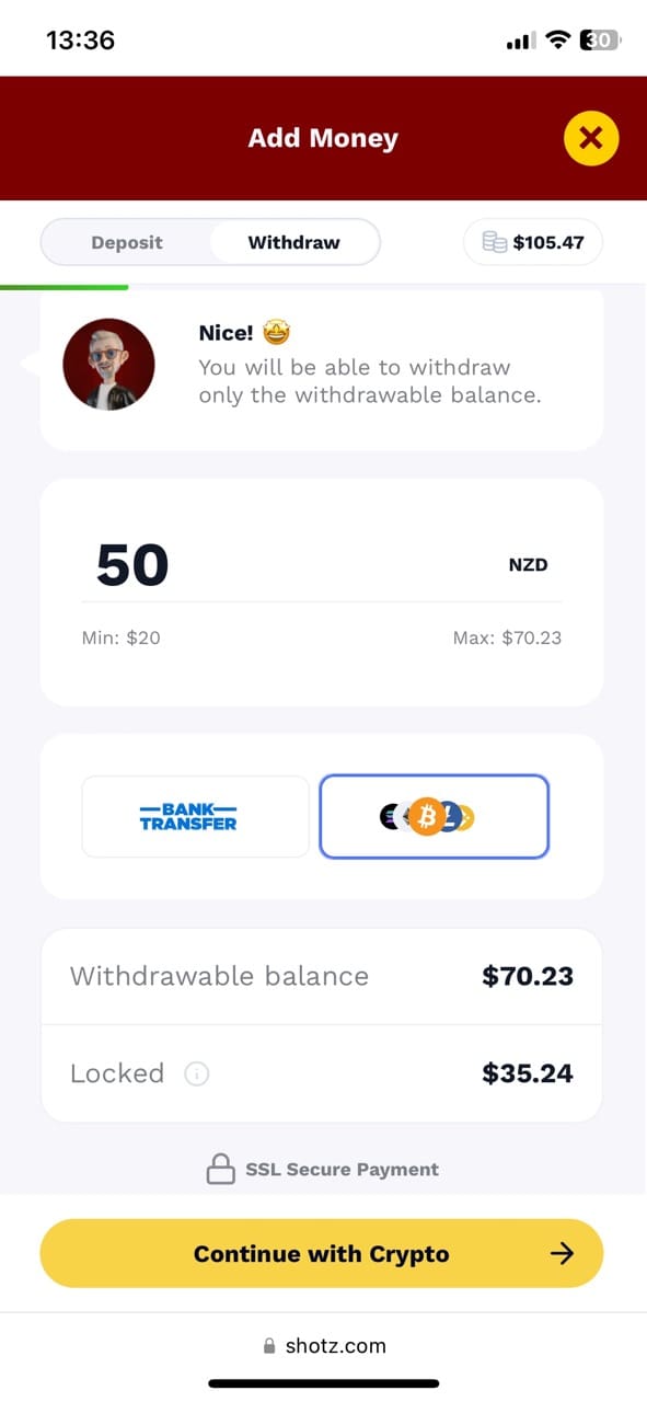 So, where do I start my review? After registering an account, which was a piece of piss and required such information as email, password, full name, address, and phone number. I then decided to make a deposit since Shotz offers a wide range of crypto payments, which is super convenient and safe. I deposited 20 USDT via TRC 20 and paid a tiny commission of 1 USDT.