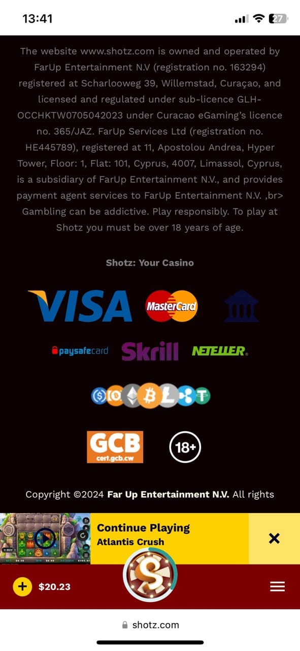 Shotz online casino is owned and operated by FarUp Entertainment N.V, the company that holds registration number 163294 and is registered at Scharlooweg 39, Willemstad, Curaçao.