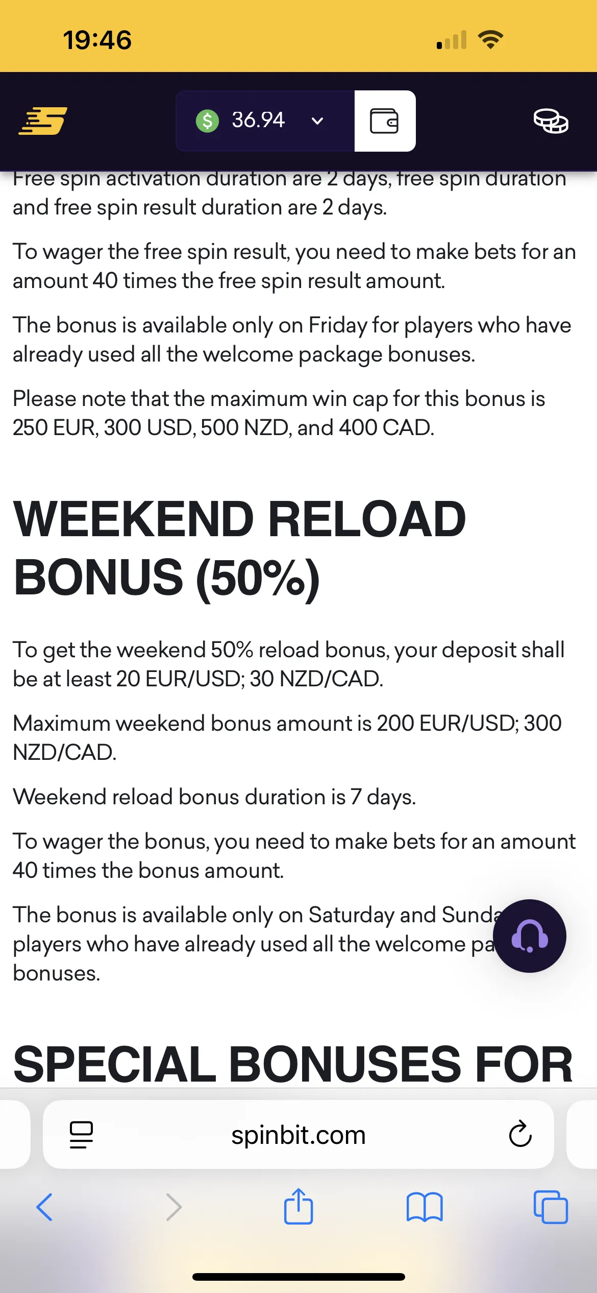 In my account, I received 36.94 NZD, and I was also planning to claim a bonus, but it turns out that SpinBit is one of those casinos where a bonus must be activated before you make a deposit. Well, I didn’t do this, and the casino’s support couldn’t help me either. Most casinos will flip a switch for a first-time oversight; here the answer was a flat “no”. To be honest, I was a bit disappointed because with other casinos, when I turned to their customer support, they activated a bonus for me. So I just decided to use my deposit to play for real money.